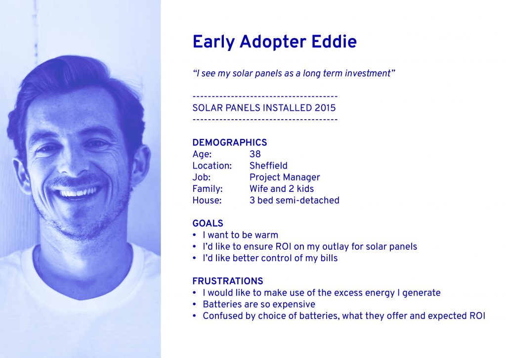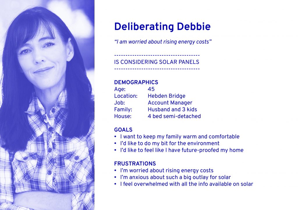 We had created two proto-personas to anchor our discussions: Eddie and Debbie. We based them on our assumptions about what prototypical consumers might need (not demographics). If we’d had the time, we’d have done some research to ground them in evidence. One for someone with solar panels, the other for someone considering getting them.